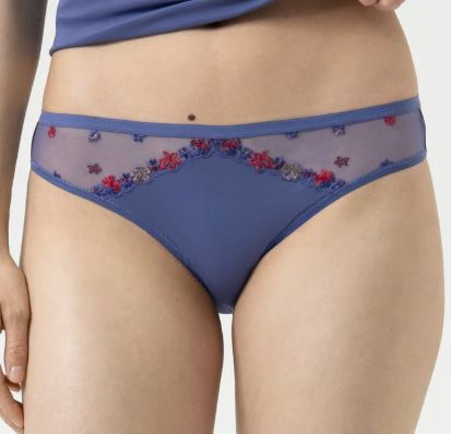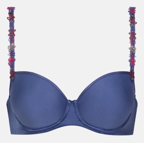 Bloemendetail op de schouderbandjes in verschillende tinten blauw, rood, bordeau en taupe.