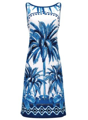 Soepel vallend kleed met witte ondergrond en palmbomen in blauwe tinten.