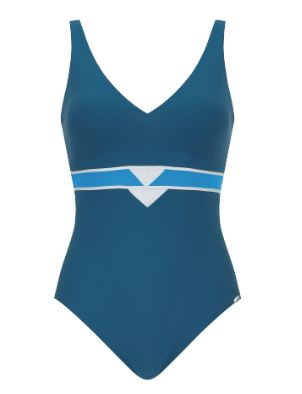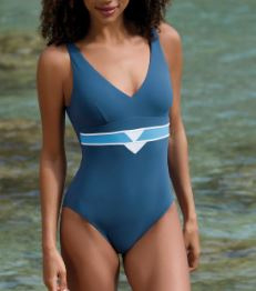 Dit badpak is eenvoudig door de effen blauwe kleur maar geeft een mooi silhouet en taile door de lichtere accent lijn.