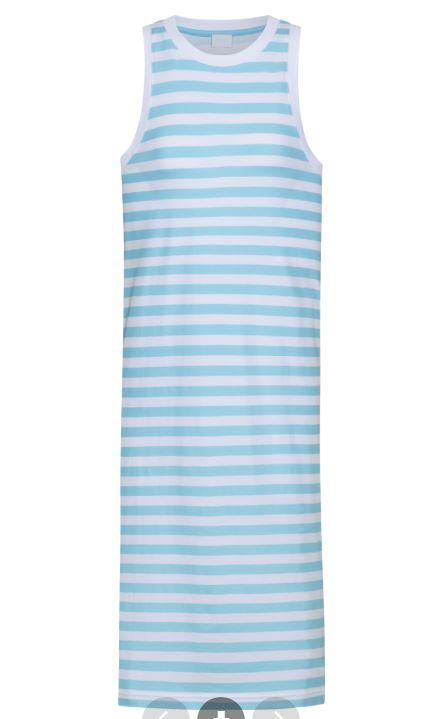 De serie Straight Waves is neutraal met zijn licht blauwe en witte strepen. Kleed zonder mouwen.